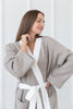 Das weibliche Model auf den Bildern trägt einen hellgrauen Morgenmantel mit weißen Details in Einheitsgröße.