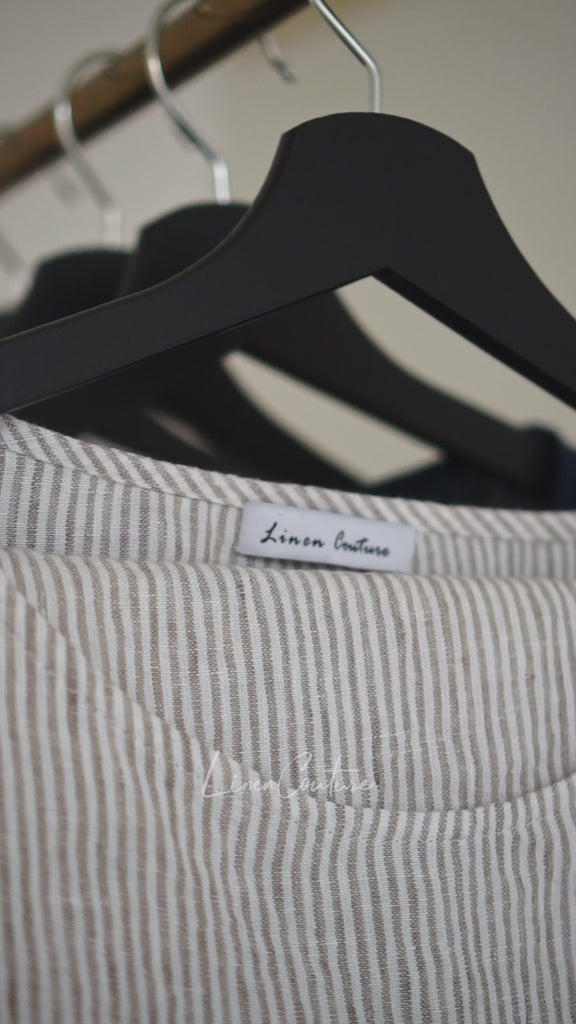 Dieses elegante Leinenkleidungsstück ist das perfekte Geschenk für sie und eignet sich hervorragend zum Entspannen zu Hause oder für einen legeren Ausflug. Sie werden sich darin immer wohlfühlen und gut aussehen, egal wo Sie sind. Die beigefarbenen Streifen verleihen Ihrem Outfit zudem eine dezente Eleganz.